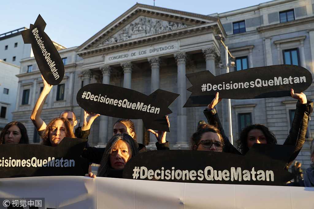 当地时间2018年10月24日,西班牙马德里,民众在议会大楼外抗议,要求停止向沙特出售武器。