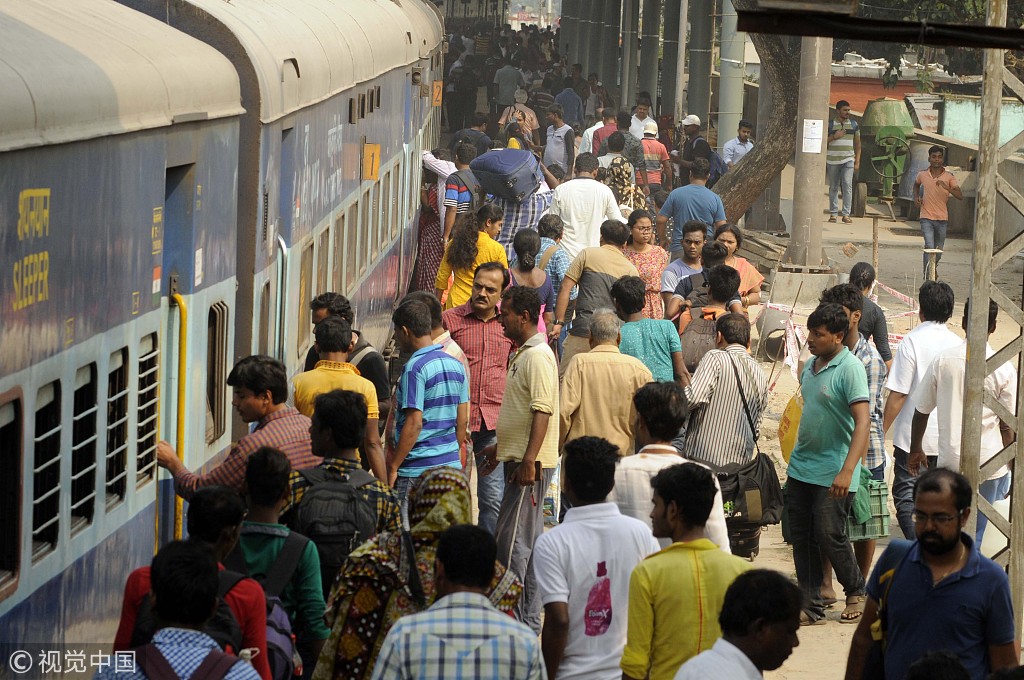 当地时间2018年10月24日,印度加尔各答,人们在当地火车站月台上候车。10月23日,2人在该地发生的踩踏事件中丧生。