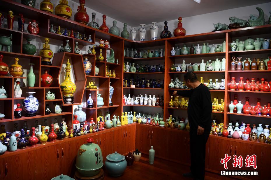 店家正在介绍展示的各类酒瓶。中新社记者 刘冉阳 摄