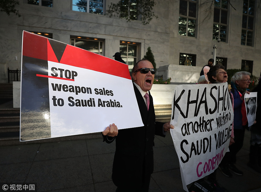 当地时间2018年10月25日,美国华盛顿,民众聚集在沙特驻华盛顿使馆外示威抗议沙特记者卡舒吉遇害。