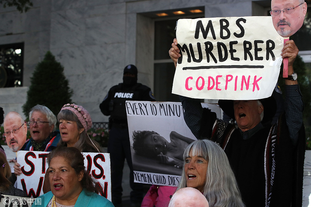 当地时间2018年10月25日,美国华盛顿,民众聚集在沙特驻华盛顿使馆外示威抗议沙特记者卡舒吉遇害。