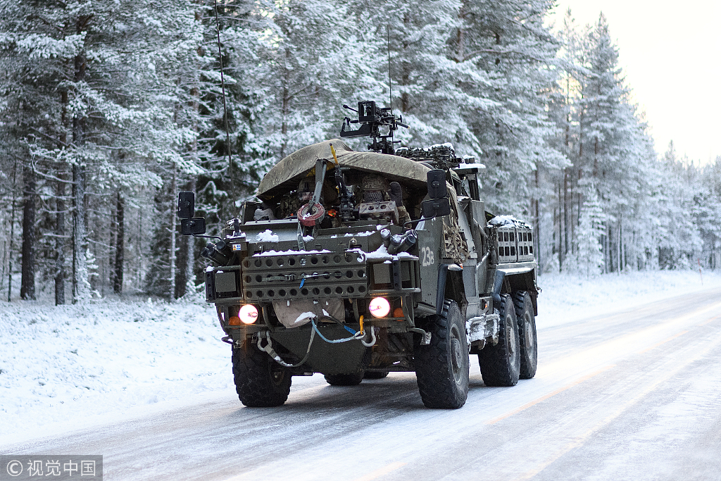 当地时间2018年10月25日,挪威特隆赫姆,当地即将举行北约国家大规模军事演习,皇家工兵部队的士兵在演习场地上巡逻。来自31个国家的4万多名军队成员将参加这次演习,以测试部队之间的互操作性。这是自上世纪80年代以来挪威举行的最大规模演习。