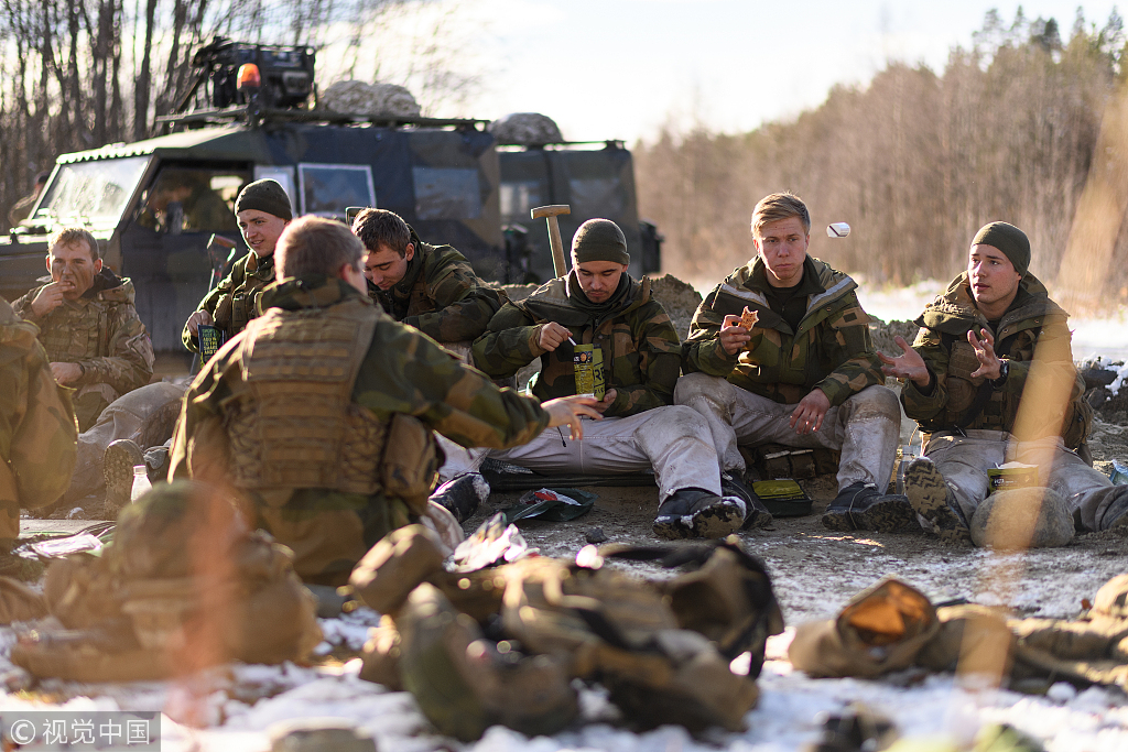 当地时间2018年10月25日,挪威特隆赫姆,当地即将举行北约国家大规模军事演习,皇家工兵部队的士兵在演习场地上巡逻。来自31个国家的4万多名军队成员将参加这次演习,以测试部队之间的互操作性。这是自上世纪80年代以来挪威举行的最大规模演习。