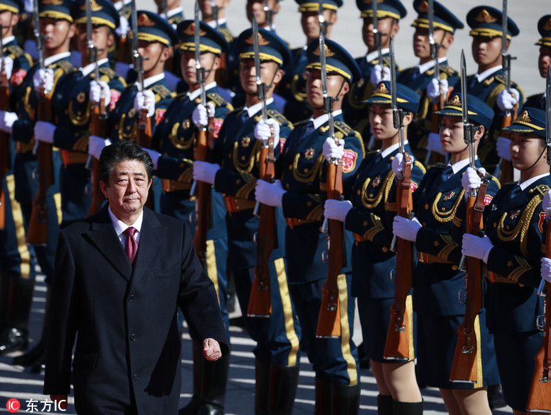 2018年10月26日,北京,北京人民大会堂举办欢迎仪式,欢迎对华进行正式访问的日本首相安倍晋三。安倍晋三和总理李克强检阅仪仗队。