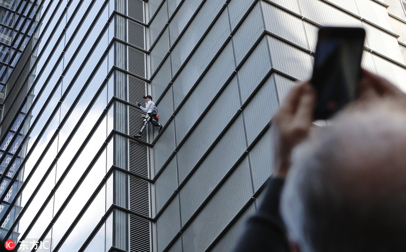 当地时间2018年10月25日,英国伦敦,法国“蜘蛛人”亚伦-罗伯特(Alain Robert)在位于金融城的赫伦大厦外墙徒手攀爬,引来民众围观。赫伦大厦是一座超过200米的摩天大楼。