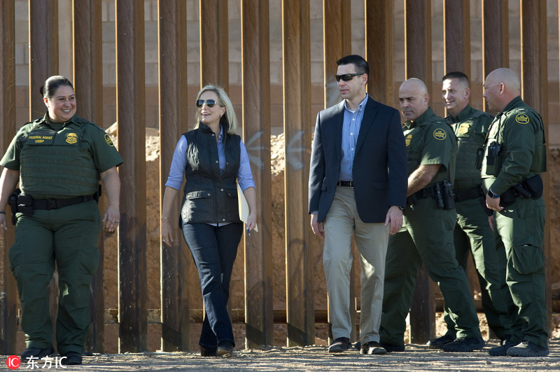 当地时间2018年10月26日,美国加州加利西哥,美国在美墨边境翻新建造的升级版隔离墙落成,国土安全部长克尔斯蒂恩-尼尔森(Kirstjen Nielsen)出席了落成仪式。升级版隔离墙高30英尺(约9.1米),取代了此前的金属波纹板隔离墙。来源:东方IC