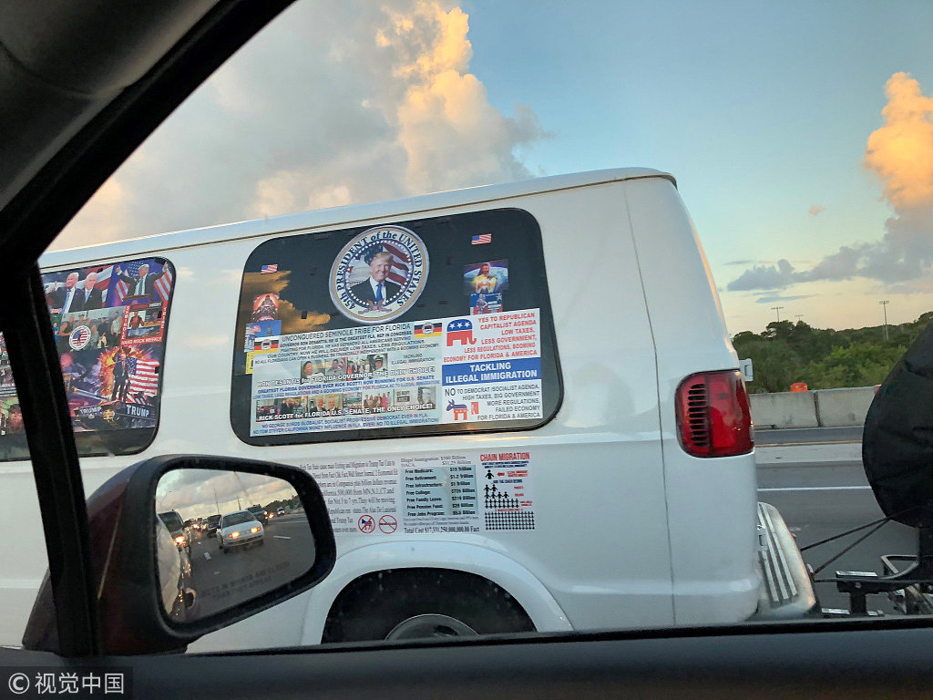 当地时间2018年10月26日,美国佛州,在炸弹包裹的调查中,一辆贴有支持特朗普和反民主党的贴纸的白色货车被发现。当天,邮寄多个炸弹包裹给部分民主党人的嫌犯被捕。据报道,嫌犯的车窗上贴了许多特朗普照片。来源:视觉中国