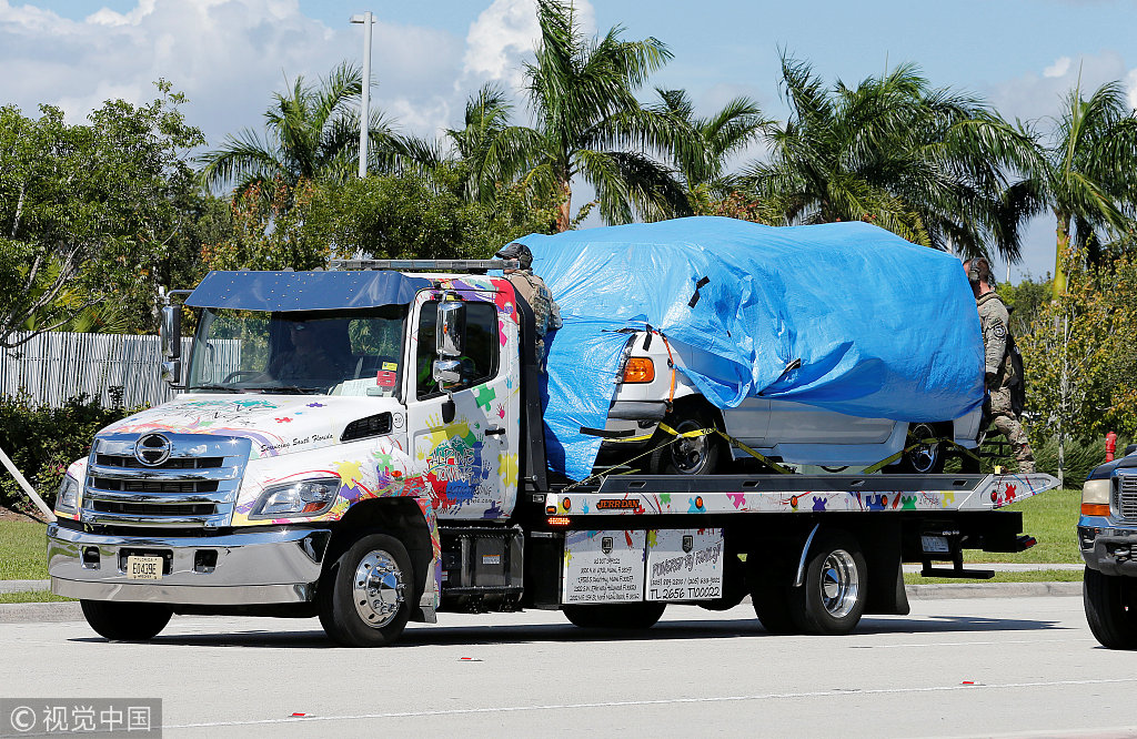 当地时间2018年10月26日,美国佛州,在炸弹包裹的调查中,一辆贴有支持特朗普和反民主党的贴纸的白色货车被发现。当天,邮寄多个炸弹包裹给部分民主党人的嫌犯被捕。据报道,嫌犯的车窗上贴了许多特朗普照片。来源:视觉中国