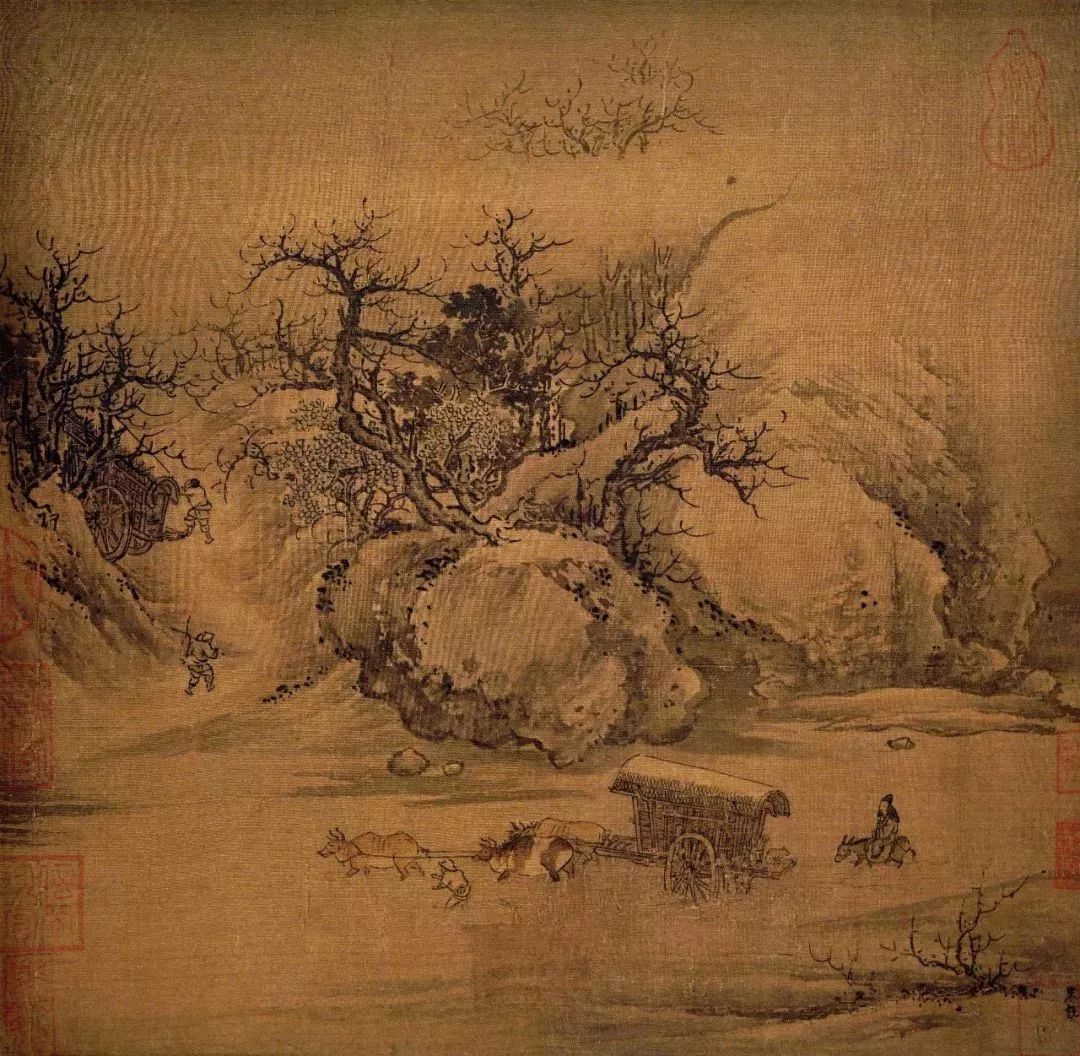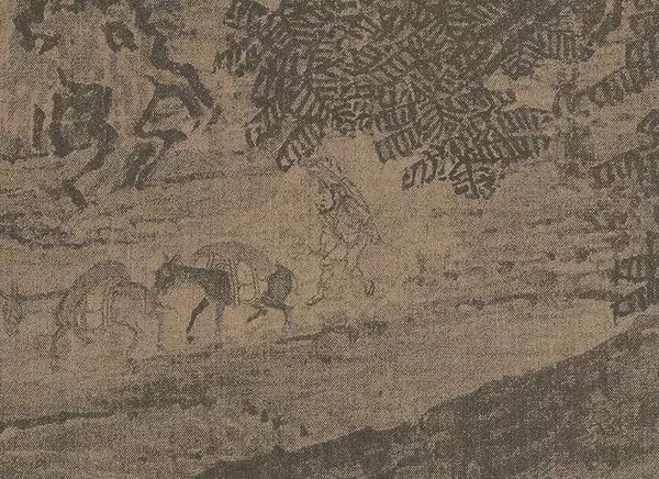 在这么一幅小画上,人物的神态、动态刻画得十分微妙。与范宽不同,朱锐的“行旅”更加突出的是旅途中的劳累,骑毛驴的文人身体松垮,目光有些涣散,赶路的辛苦一览无余。