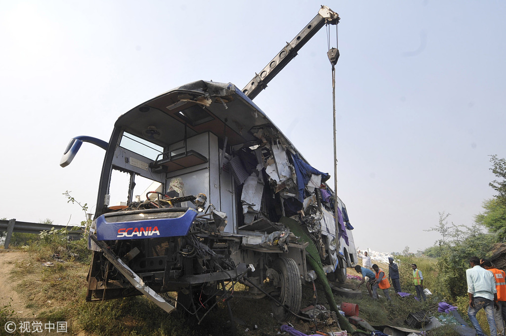 当地时间2018年10月27日印度诺伊达,一辆旅游巴士在亚穆纳高速公路上与卡车相撞,造成4人死亡,11人受伤。
