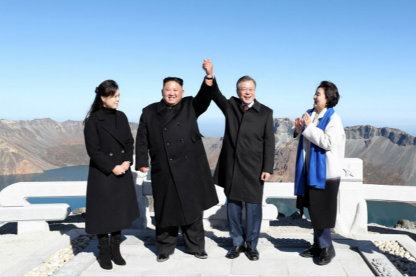 海外网10月28日电 9月20日,韩国总统文在寅访朝期间,曾与朝鲜最高领导人金正恩登顶白头山(长白山)。10月28日,文在寅回忆起与金正恩登山的经历时表示,“如果金正恩对韩国进行回访,愿意登上汉拿山,我们可以一起登顶山峰”。