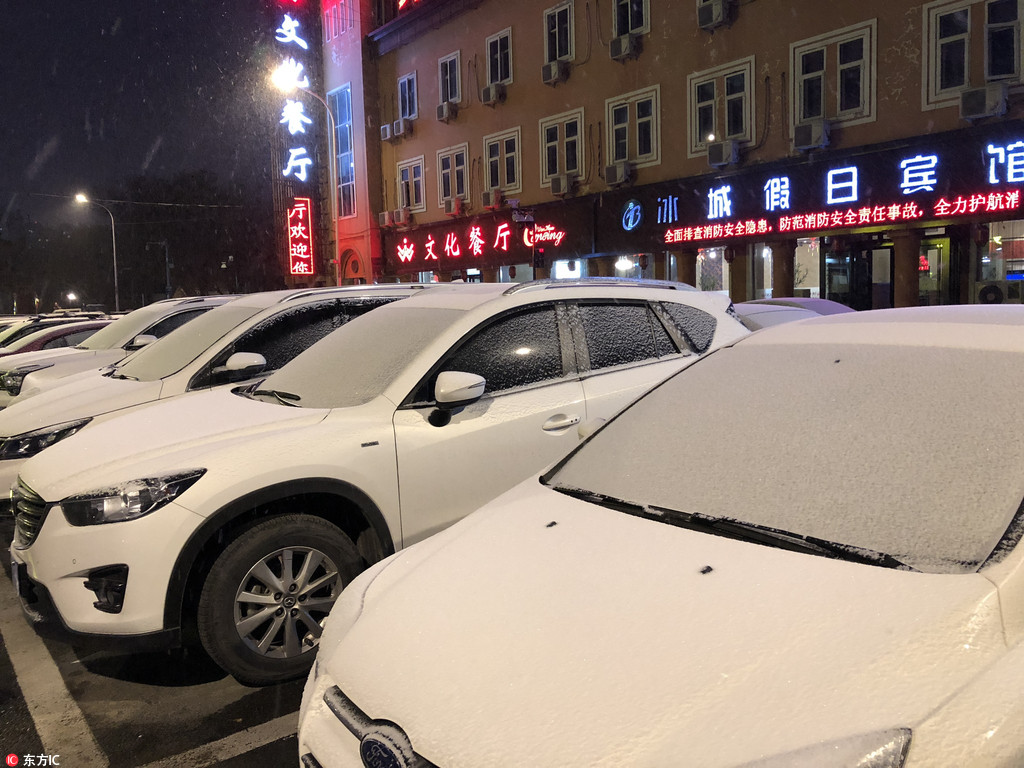 10月28日,黑龙江哈尔滨,冰城最低气温骤降至-2摄氏度。夜晚,雪花飞舞,道路两旁,树叶、汽车上被披上了一层白色的冬衣。哈尔滨的冬天来了!(来源:东方IC)