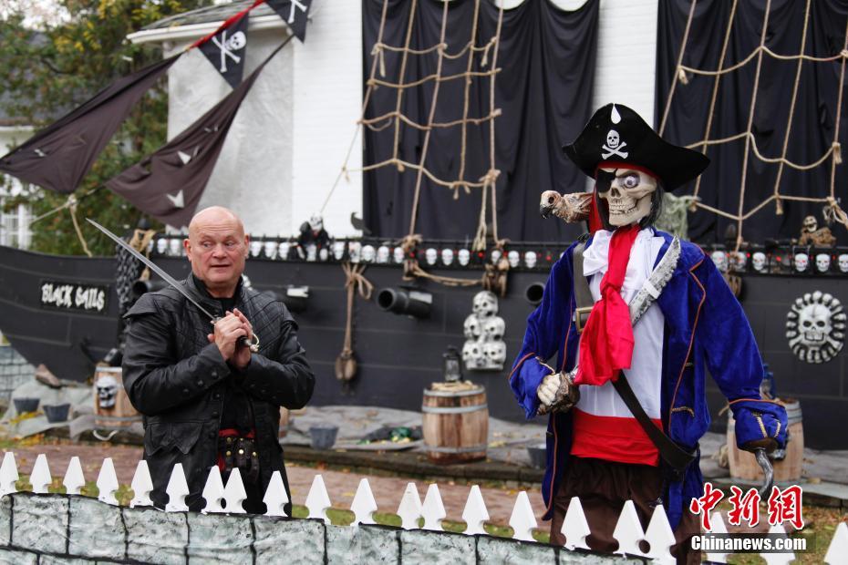 当地时间10月28日,加拿大大多伦多地区民众已开始以新奇甚至“大胆”的方式迎接即将到来的万圣节前夜。图为万锦市(Markham)一户人家连续第九年将房屋打造成海盗船。中新社记者 余瑞冬 摄