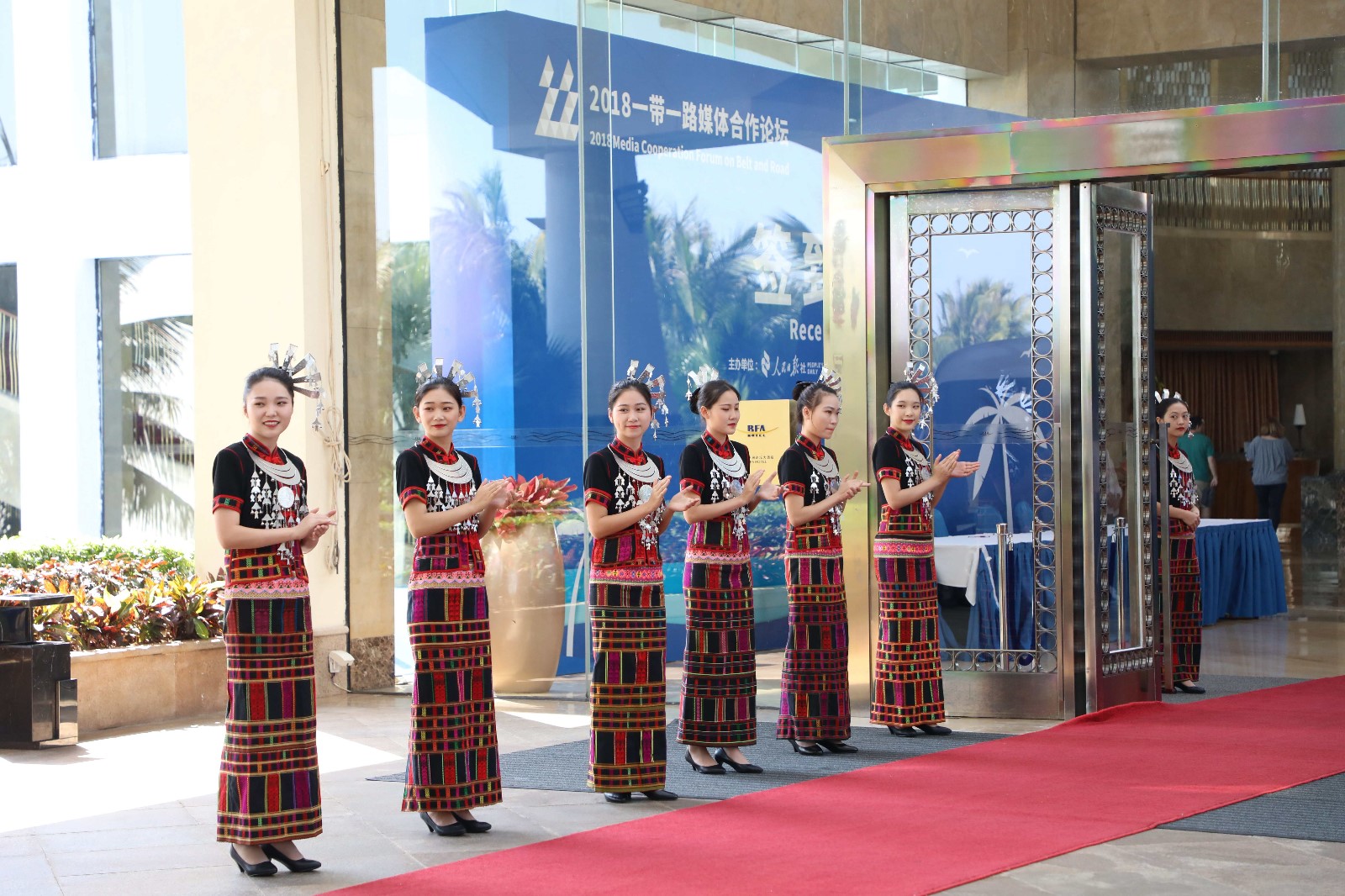 论坛开幕前夕,身穿当地特色服饰的工作人员热情欢迎远道而来的嘉宾。(摄影/付勇超 文/杨佳)