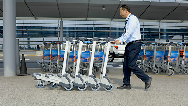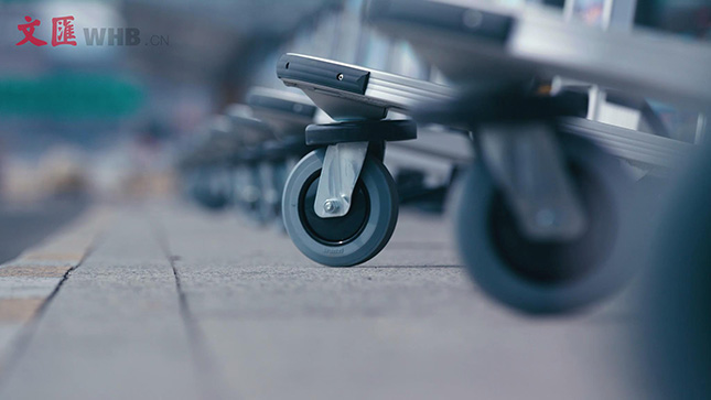 这些天,虹桥机场航站楼里的手推车,更换一新,“穿”上了蓝色的进博会标识。别看小小的手推车,放在哪里、怎么摆放,这些细节都很有讲究。在虹桥机场从事手推车工作18年的张波说,他和团队300多位员工,负责包括候机楼、停车场、出租站点、公交站点等在内的全部旅客用车需求,总共有8000多辆手推车,在70多万平方米的空间里收车、摆放、整理,每天要走3万多步。