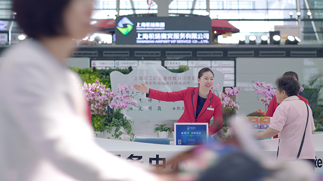在浦东国际机场候机楼,“翔音组”一身靓丽红装。一位服务人员正站在问讯台外,为旅客解答问题。这个由劳模史志瑛带领的“百问不倒、问号拉直、微笑画圆”的现场问讯服务台,每天接待问询1000多人次。进博会前,他们跨前一步,推出“里+外”服务,方便旅客不用走近问讯台就能获得“贴身”问讯。