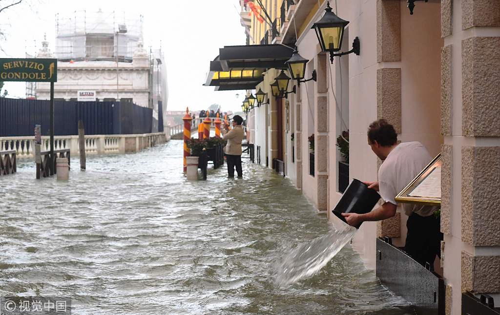 当地时间2018年10月29日,意大利威尼斯,威尼斯水位上涨,水漫街头。