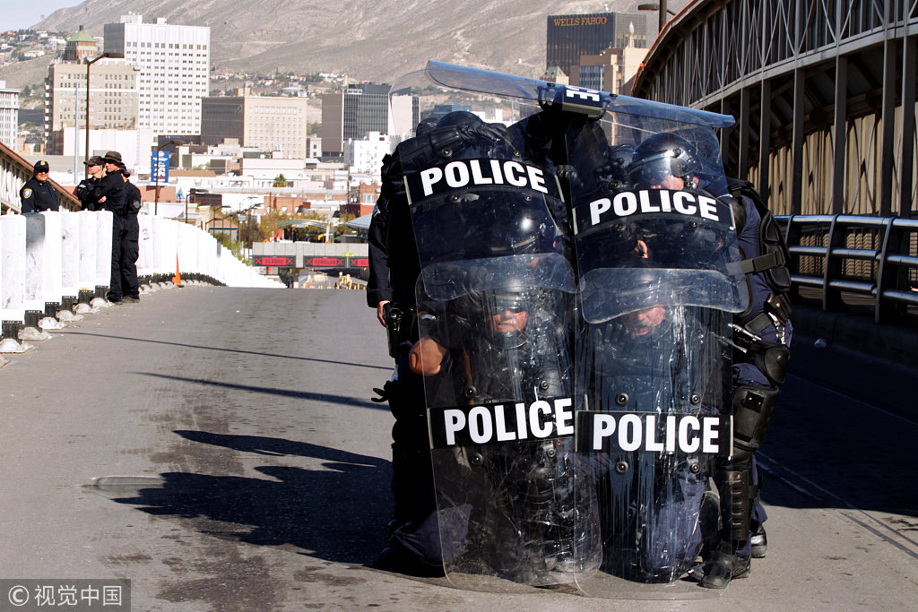 当地时间2018年10月29日,美国防暴警察在美墨边境大桥参加安全演习。美国官员29日表示,五角大楼将在美墨边境部署5000名现役军人,以防止来自中美的“大篷车”移民非法进入美国。