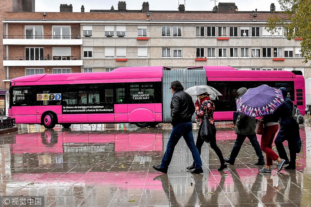 法国敦刻尔克推粉色免费公交 巴黎女市长到访“挤公交”