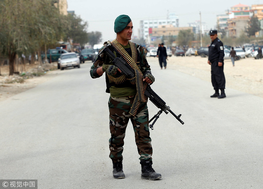 当地时间2018年10月31日,阿富汗喀布尔,阿富汗安全部队检查自杀式爆炸袭击现场。阿富汗首都喀布尔一所监狱附近的一辆汽车发生自杀式爆炸,造成7人死亡,5人受伤。