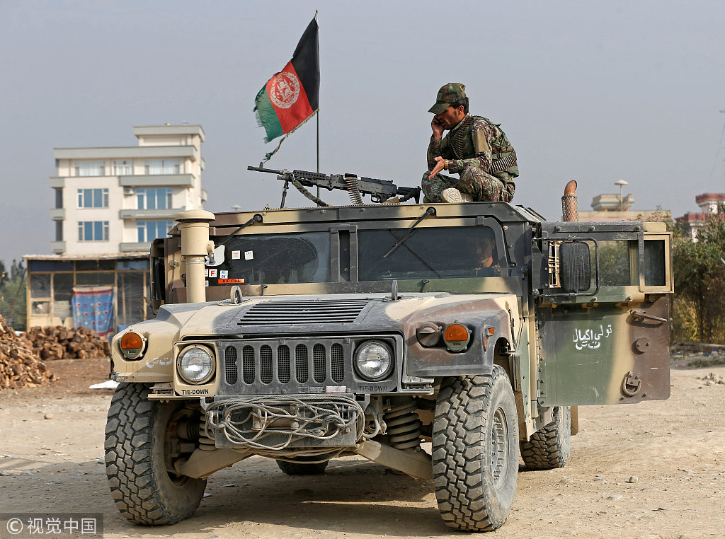 当地时间2018年10月31日,阿富汗喀布尔,阿富汗安全部队检查自杀式爆炸袭击现场。阿富汗首都喀布尔一所监狱附近的一辆汽车发生自杀式爆炸,造成7人死亡,5人受伤。