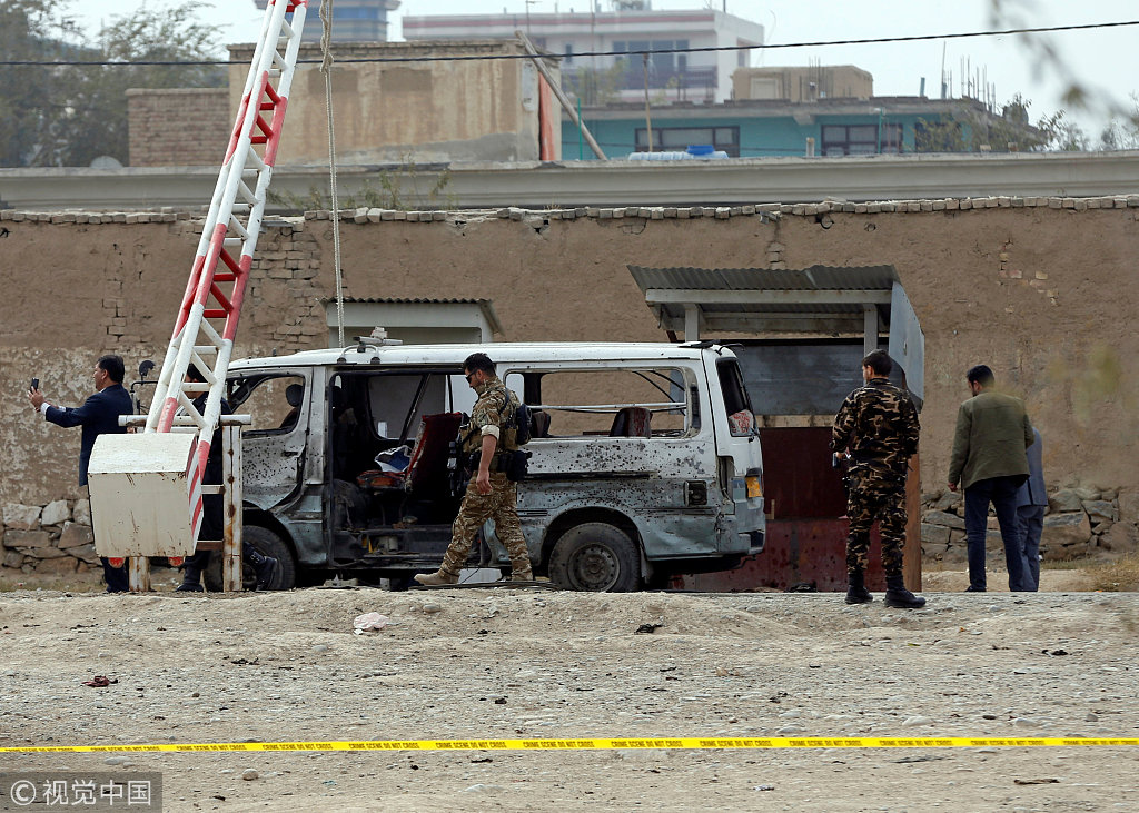 当地时间2018年10月31日,阿富汗喀布尔,阿富汗安全部队检查自杀式爆炸袭击现场。阿富汗首都喀布尔一所监狱附近的一辆汽车发生自杀式爆炸,造成7人死亡,5人受伤。