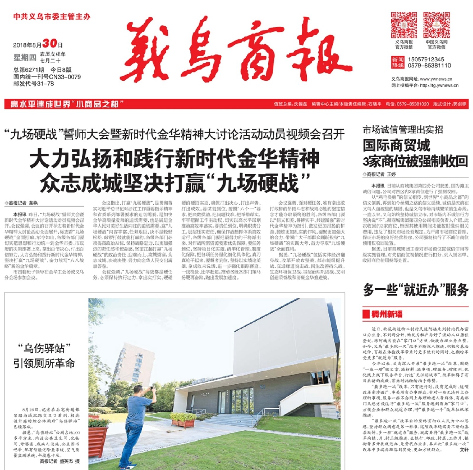 今年8月底据《义乌商报》报道:记者在义乌市后宅街道银尔路与城北路交叉口看到,极具设计感的综合体厕所“乌伤驿站”已经落成。据悉,“乌伤驿站”公厕占地100多平方米,内设公共卫生间、化妆间、母婴室、残疾人设施、公益图书吧等,配有智能化除臭系统、空气质量监测系统,科技感十足。