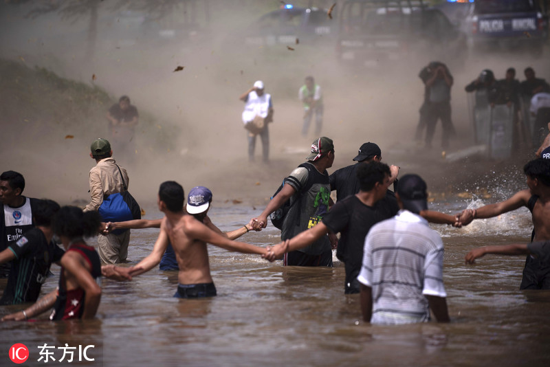 当地时间2018年10月29日,墨西哥与危地马拉边境,第二批中美洲移民大军向美国挺进,涉险蹚过危墨边境的Suchiate河,涌入墨西哥。