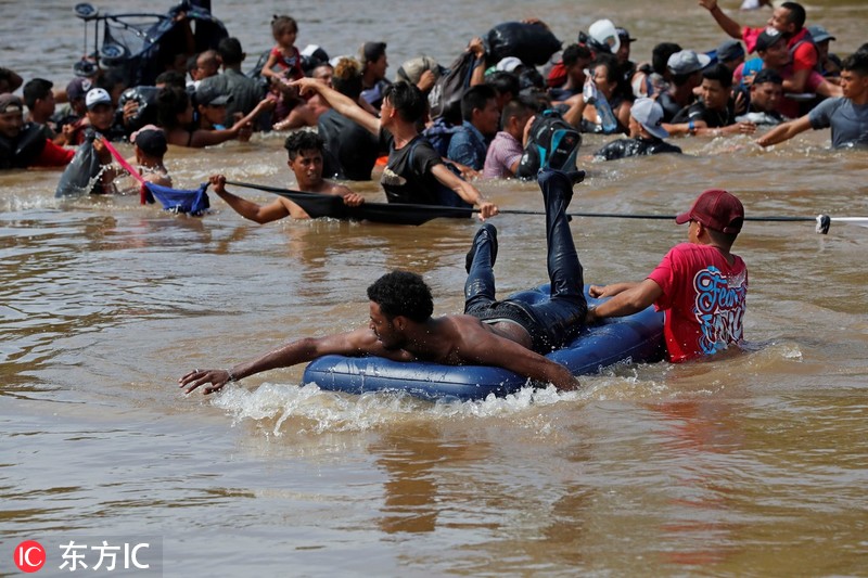 当地时间2018年10月29日,墨西哥与危地马拉边境,第二批中美洲移民大军向美国挺进,涉险蹚过危墨边境的Suchiate河,涌入墨西哥。