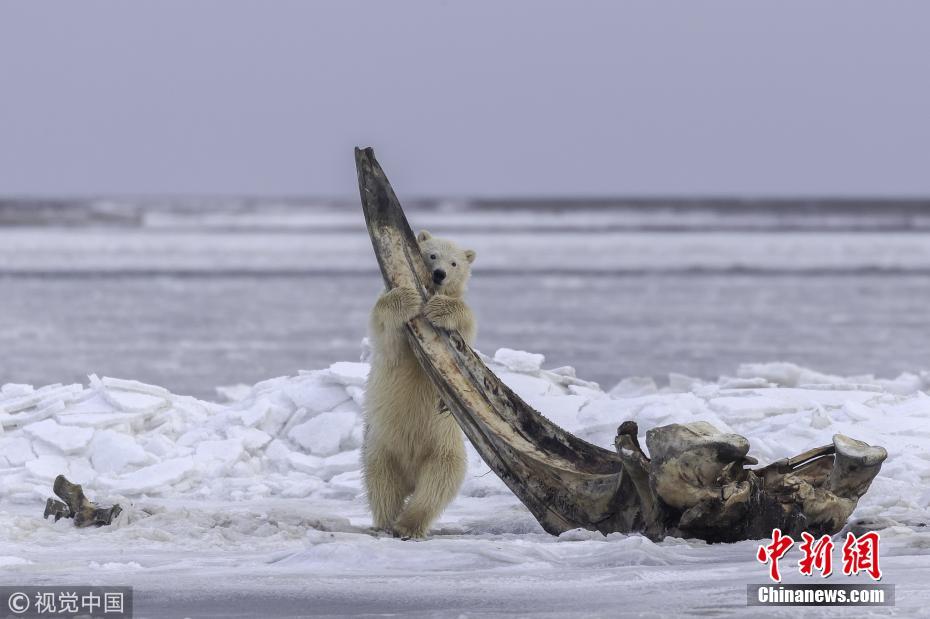 11月1日讯,美国阿拉斯加州,一只北极熊妈妈带着幼崽们外出觅食,发现了一节长4.5米的北极露脊鲸骸骨。75吨重的鲸鱼对因纽皮亚特人来说是神圣的,他们每年要吃三次鲸鱼,把骨头放在指定的地方,让北极熊吃完粘在骨头上的碎肉。摄影师Eiji Itoyama为拍摄此照片在位于北冰洋边缘的阿拉斯加卡克托维克村停留了5天。