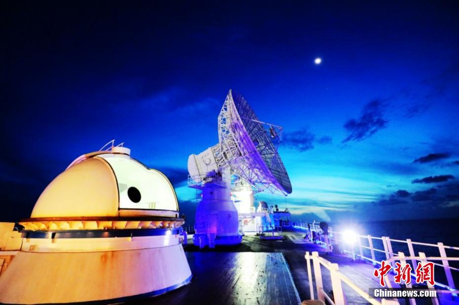 火箭升空飞行20多分钟后,远望3号船在距离祖国万里之遥的大洋深处及时发现并成功捕获目标,船载USB统一测控系统迅速接收到火箭遥测参数,并及时处理传送至西安卫星测控中心、西昌卫星发射中心,为中心判断火箭飞行状态提供重要依据;两套船载航天测控设备同时对火箭及卫星开展测量工作,并及时、准确计算向西安卫星测控中心提交了高精度数据,整个海上测控过程持续近10分钟,为火箭三级二次关机、星箭分离等一系列关键动作提供了有力测控支撑。图为深夜,远望3号船精准测控。 高超、何露东杰/文 亓创 摄