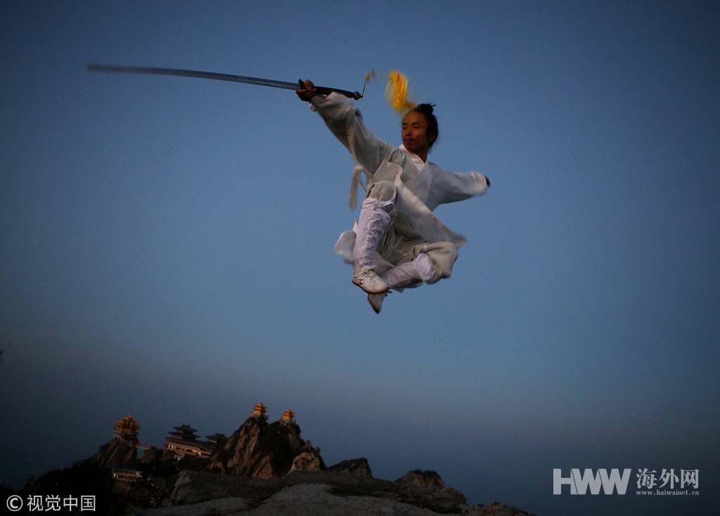 2016年10月2日,河南洛阳老君山,粉丝扮作《青云志》的碧瑶跟随道士在伏牛山主峰两千米的悬崖绝壁舞剑练功。