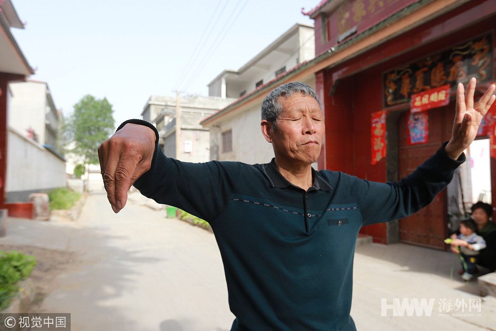 2017年5月4日,河南焦作,温县陈家沟,63岁的村民陈长有年轻时跟着邻居陈长义习得太极拳,放下手里吃了一半的蒜薹,他就大方地起势,演示给我们看,这里九成村民都会太极拳。