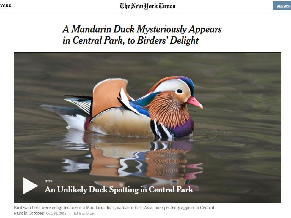 这种主要生活在东亚和欧洲的鸳鸯,出现在纽约这样一个美国大都市里,真的是一个迷。