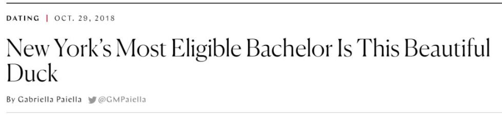 这只高颜值的雄性鸳鸯,甚至引起了《纽约杂志》(New York Magazine)约会(Dating)栏目的关注。该杂志直接在标题称:这只美翻的鸭子已然是纽约最令人向往的单身汉了。