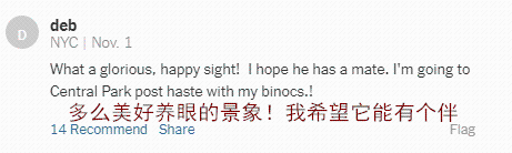 据CNN报道,一位名为De Oliveira的当地观鸟爱好者,在出差期间就关注到了这只鸳鸯的消息。为了能拍到这只鸳鸯,早上出差回来,飞机一落地,他就直接赶到家里,带上相机器材后就立刻奔赴中央公园了。