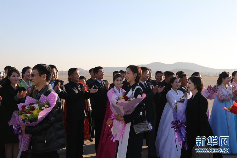 这是中国文艺工作者代表团在机场受到朝鲜民众热烈欢迎。 新华社记者程大雨摄