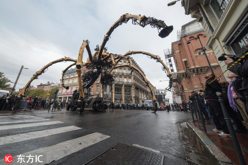 当地时间2018年11月2日,法国图卢兹,法国街头戏剧公司La Machine在当地举办名为“Le Gardien du Temple”的展出表演,半人半牛怪弥诺陶洛斯和蜘蛛机械怪兽亮相,吸引大批民众围观。图片来源:东方IC