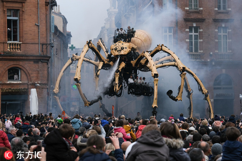 当地时间2018年11月2日,法国图卢兹,法国街头戏剧公司La Machine在当地举办名为“Le Gardien du Temple”的展出表演,半人半牛怪弥诺陶洛斯和蜘蛛机械怪兽亮相,吸引大批民众围观。图片来源:东方IC