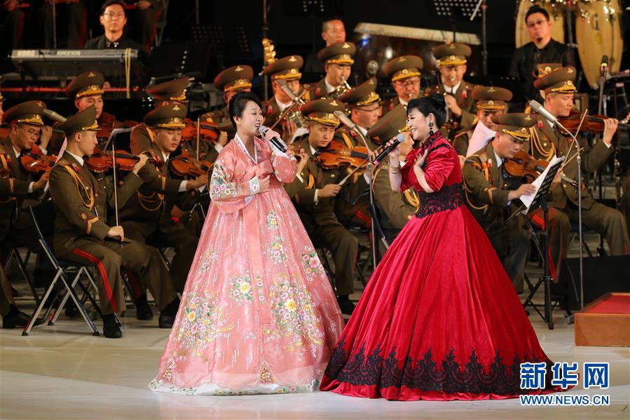 11月3日,在朝鲜平壤,中国歌唱家殷秀梅(右)和朝鲜歌唱家黄银美在演出现场演唱。 中朝文艺工作者首场联合演出当日在平壤万寿台艺术剧场举行,中朝两国文艺工作者联袂奉献了两国人民喜爱的歌曲、舞蹈等节目。 新华社记者 程大雨 摄