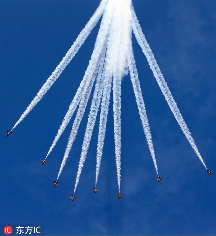 当地时间2018年11月3日,韩国全罗南道灵岩郡,当地举办航空体育庆典,韩国“黑鹰”特技飞行队亮相表演。