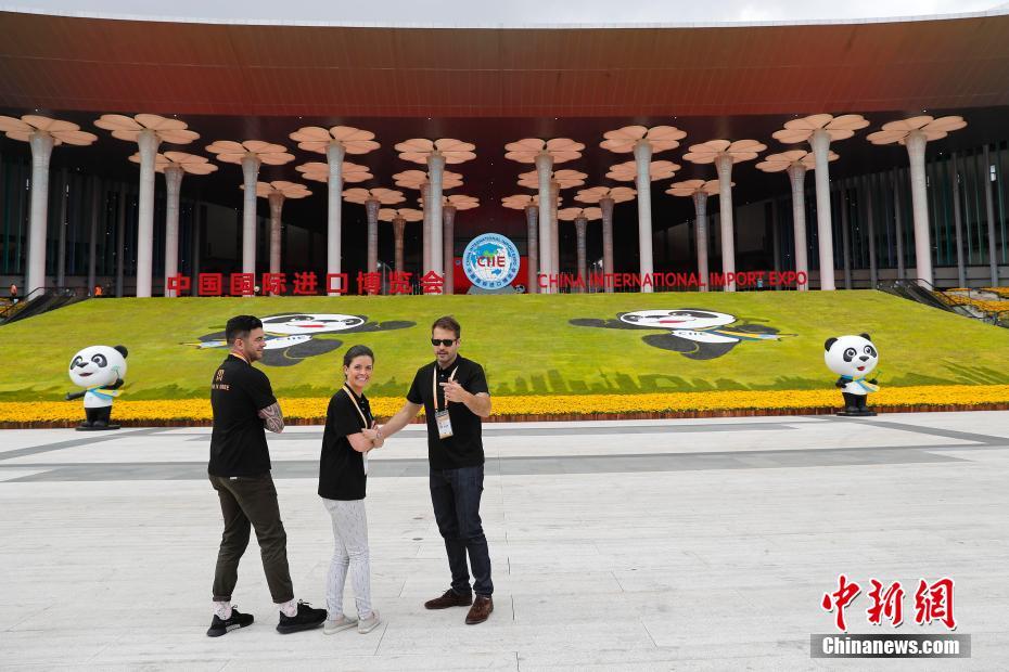 11月4日,参展商在国家会展中心南广场上,与中国国际进口博览会吉祥物合影留念。5日,首届中国国际进口博览会将在上海的国家会展中心开幕。 中新社记者 殷立勤 摄