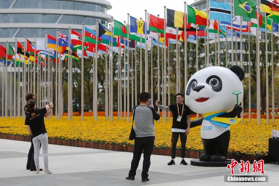 11月4日,参展商在国家会展中心南广场上,与中国国际进口博览会吉祥物合影留念。5日,首届中国国际进口博览会将在上海的国家会展中心开幕。 中新社记者 殷立勤 摄