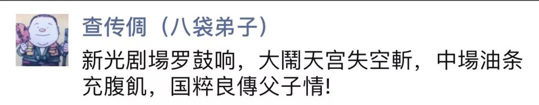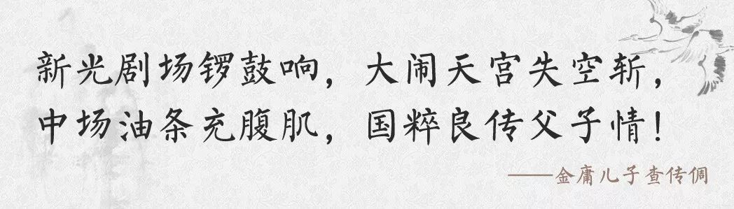 金庸是戏迷,这非新鲜事。查传倜也深受父亲影响,成为一个戏迷。对此,查传倜也是用了28个字来浓缩他与父亲金庸当年看戏的生活。“新光剧场锣鼓响,大闹天宫失空斩,中场油条充腹肌,国粹良传父子情。”这个在京剧里大闹天宫的孙悟空,幻化成金庸武侠小说人物,就是《神雕侠侣》中的神雕大侠杨过。