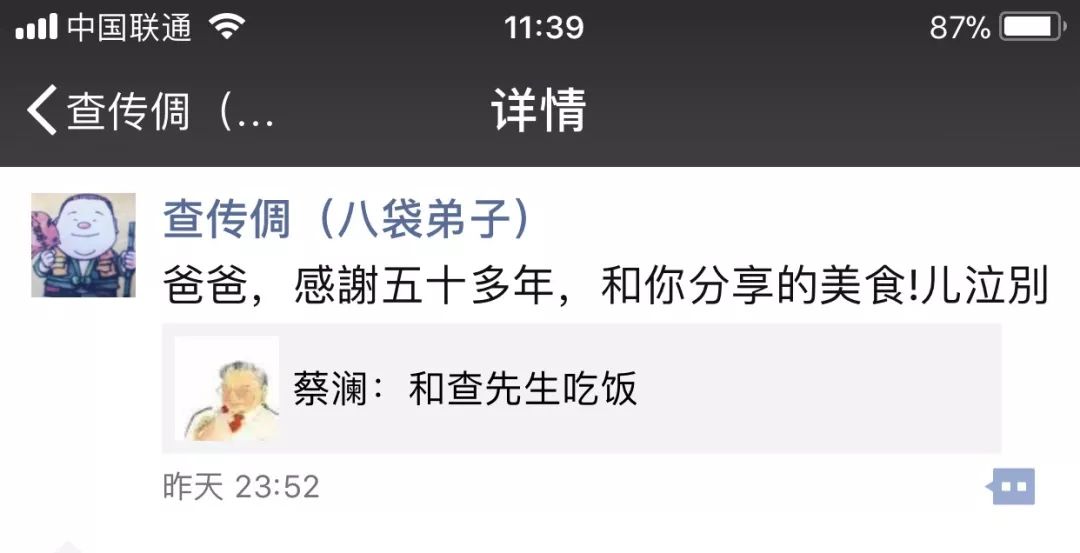 不过,他也用三首七言诗共计84个字表露了家人们送别父亲金庸的堂前幕后,以及他对父亲辞世的真实心情。11月3日23:52,查传倜在微信朋友圈转发《蔡澜:和查先生吃饭》这篇文章时,还是忍不住悲伤之情:“爸爸,感谢五十多年,和你分享的美食!儿泣别。”
