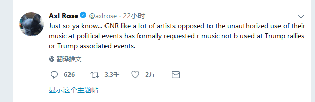 “像许多反对在政治活动中未经授权使用他们的音乐的艺术家一样,我们乐队已经正式要求特朗普集会或特朗普有关的活动中不使用我们的音乐。”罗斯在推特上写道。