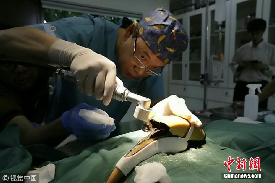 2018年11月3日讯(具体拍摄时间不详),在新加坡的裕廊飞禽公园,一只22岁大斑犀鸟Jary 在手术后戴着一个3D打印的喙,原来的喙因为癌症裂开了。新加坡的裕廊飞禽公园是几种犀鸟的家园,这其中就有Jary,最近Jary一直在跟癌症作斗争,一开始只是有个裂缝,CT检查后发现裂缝确实是由癌症引起的。这种疾病已经夺去了另外两只犀鸟的生命。兽医不想Jary有同样的命运,所以他们决定尝试一些别的治疗方案。经过近两个月的准备,兽医们与当地工程师合作,为Jary设计了3D打印假肢。3D模型由动物诊所的名誉顾问Hsu Li Chieh评估,而癌症部分则通过外科手术切除,然后借助钻孔导向器,用铆钉把3D打印喙固定到鸟喙上,将暴露的组织覆盖好,最后用牙科专用树脂密封。Jary将一直戴着这个3D打印的喙,直到新喙长出来为止。 图片来源:视觉中国
