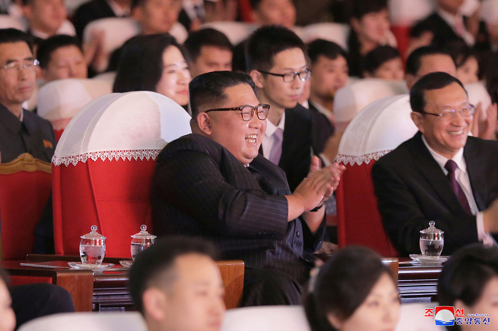 当地时间2018年11月3日,朝鲜平壤,朝鲜劳动党委员长、国务委员会委员长金正恩在平壤观看中朝文艺工作者首场联合演出。 中朝文艺工作者首场联合演出当日在平壤万寿台艺术剧场举行,中朝两国文艺工作者联袂奉献了两国人民喜爱的歌曲、舞蹈等节目。
