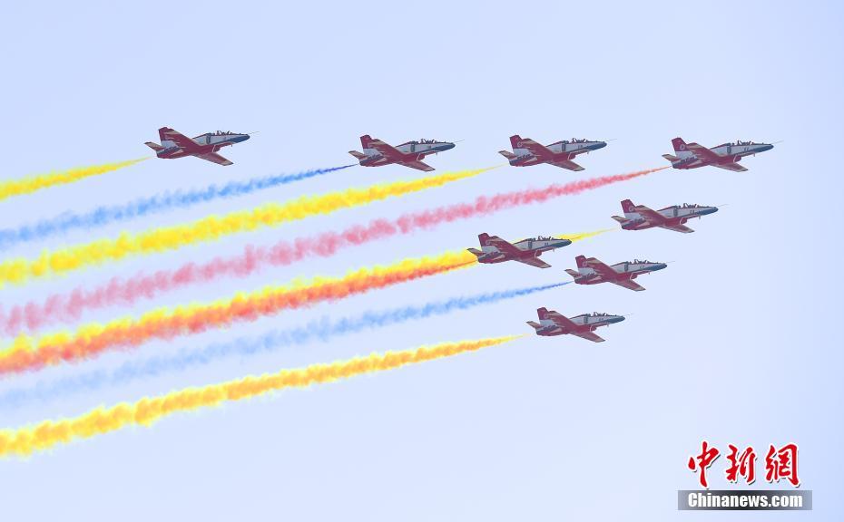 11月6日,第十二届中国国际航空航天博览会在珠海开幕。中国人民解放军八一飞行表演队、空军航空大学“红鹰”飞行表演队、歼-20战机等多机种精彩上演。图为空军航空大学“红鹰”飞行表演队。中新社记者 陈文 摄