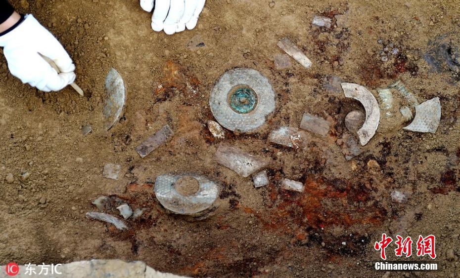 据介绍,该墓型制较为特殊,由墓道、主墓室、侧室、廊道、耳室、坠室6部分组成。工作人员已经清理出墓主人骨架一具,葬具为双棺,棺内陪葬有大量玉器。主墓室内发现大雁铜灯、铜镜、耳杯等随葬品,在北侧一耳室里发现了彩绘陶壶、铜盘、铜壶、铜炉、铜钵、铜盆等随葬品。文字来源:新华网